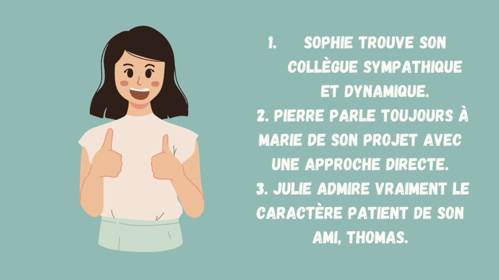 Sympathique et communicative, Léa est une personne à qui on peut faire confiance. À l’écoute, elle trouve toujours les bons mots pour aider ses proches. Sociable et chaleureuse, Léa établit facilement des 10 relations avec les autres. Elle est aussi très émotive. Directe et spontanée, elle n’hésite pas à dire ce qu’elle pense, en bien ou en mal. Pleine d’énergie, Léa est dynamique et active. Dans le milieu professionnel, Léa 15 motive les autres et reste optimiste, même en cas de difficultés.